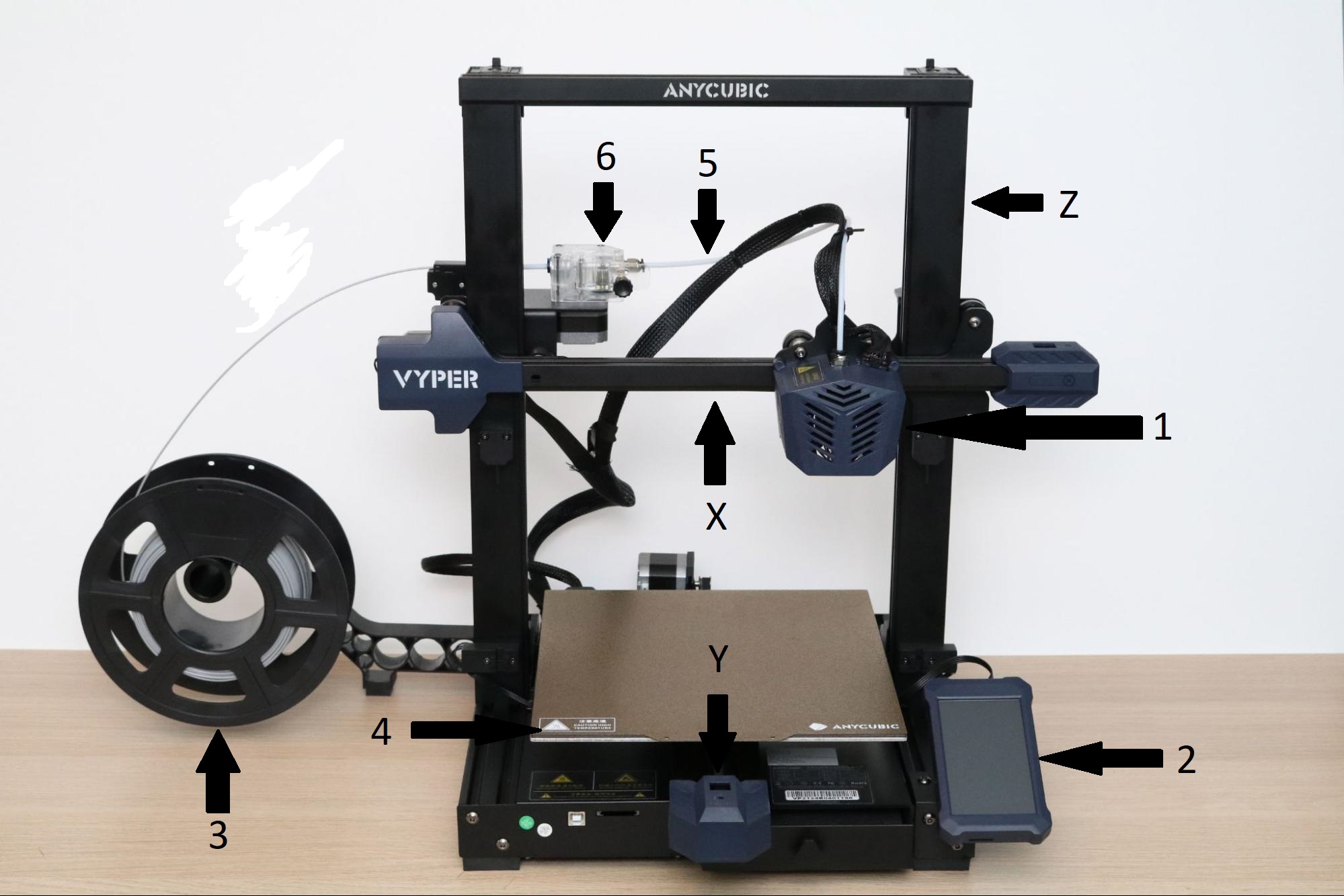 - XYZ: Les imprimantes 3D utilisent trois axes de mouvement, X, Y, et Z, pour contrôler soit le déplacement du plateau d'impression, soit celui de la tête d'impression. La manière dont l'imprimante va bouger sur ces trois axes peut varier dépendemment de la conception de l'appareil. Sur cette image, il s'agit d'une imprimante cartésienne, dans laquelle les trois axes se déplacent de manière indépendante (chacun leur moteur). Ainsi, le lit se déplace sur l'axe des Y et la tête se déplace sur l'axe des X et des Z. Un autre mode de fonctionnement que l'on retrouve fréquemment est Core XY (voir photo de l'imprimante Bambu Lab dans la section historique) qui utilise le même système afin de déplacer les axes X et Y,ce qui permet une impression plus rapide. L'axe des Z est alors géré par le lit qui descend progressivement pendant l'impression. il existe une multitude d'autres modes de fonctionnement (e.g. SCARA, ceinture, polaire), mais ils sont utilisés de manière marginale dans les imprimantes commerciales.