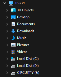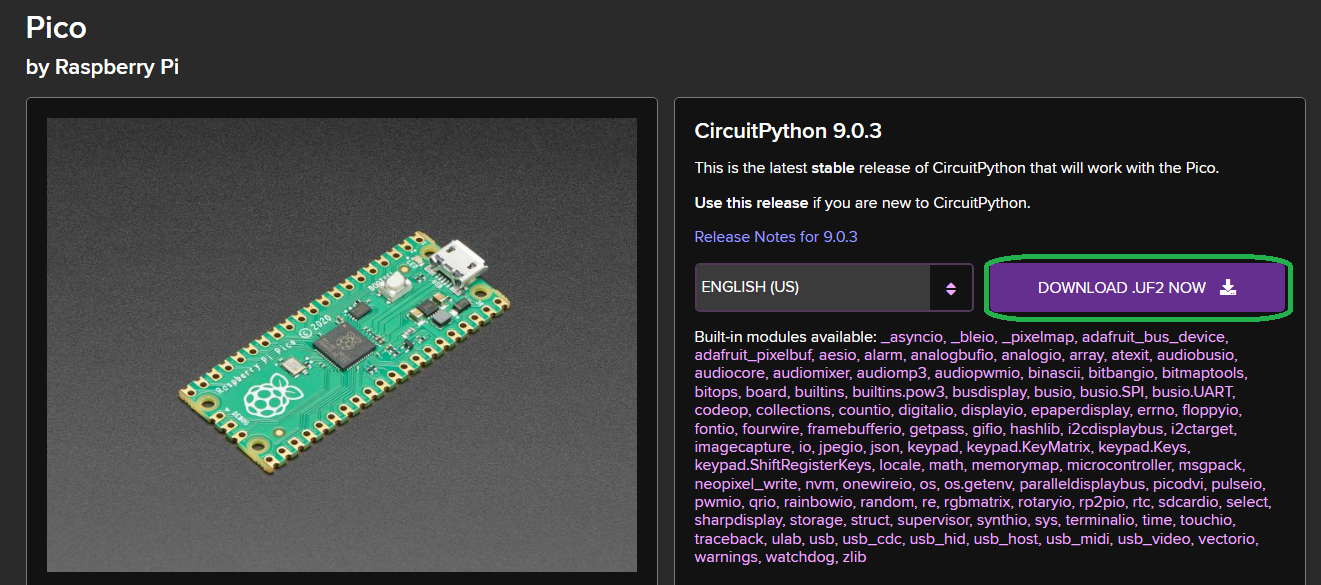 - Circuitpython: il faut d'abord signaler au microcontrôleur que la plateforme utilisée sera le circuitpython, afin d'être compatible avec la programmation qui est fournie. Cela va préparer l'appareil à recevoir les fichiers qui vont lui donner les instructions nécessaires. D'abord, aller télécharger le fichier sur la page officielle de circuitpython  à l'endroit indiqué sur l'image ci-dessous. Ensuite, prendre le fichier UF2 téléchargé et le glisser sur l'emplacement du raspberry pico (il va apparaître comme une clé USB nomme RPI-RP2 dans les dossiers de l'ordinateur). Une fois que c'est fait, le dossier va disparaître quelques secondes puis revenir sous le nom de CIRCUITPY, comme sur les captures d'écran ci-contre.
