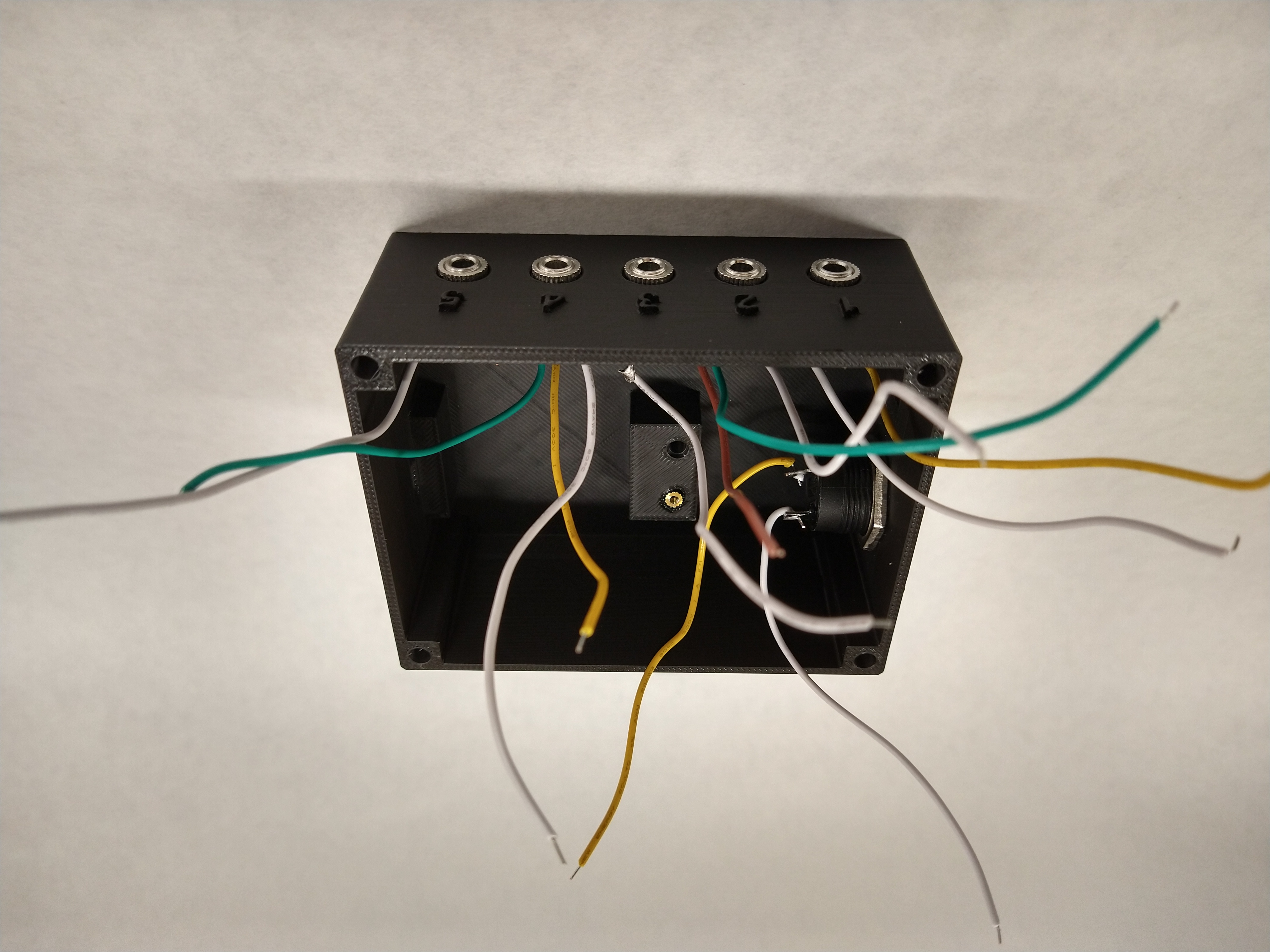 Préparation du boitierFer à souder, pinces D'abord, utiliser le fer à souder afin d'introduire les inserts de cuivre M2 dans les deux petits trous à l'intérieur du boitier. Puis, visser les cinq prises en utilisant leurs boulons dans les cinq trous correspodants du boitier. Finalement, insérer le bouton dans le boitier (par l'extérieur), puis visser le boulon le retenant à l'intérieur. D'abord, utiliser le fer à souder afin d'introduire les inserts de cuivre M2 dans les deux petits trous à l'intérieur du boitier. Puis, visser les cinq prises en utilisant leurs boulons dans les cinq trous correspodants du boitier. Finalement, insérer le bouton dans le boitier (par l'extérieur), puis visser le boulon le retenant à l'intérieur.
