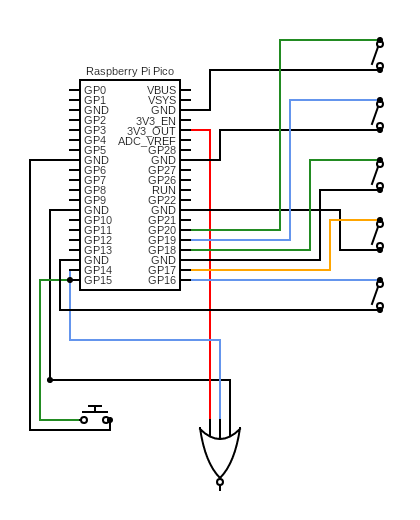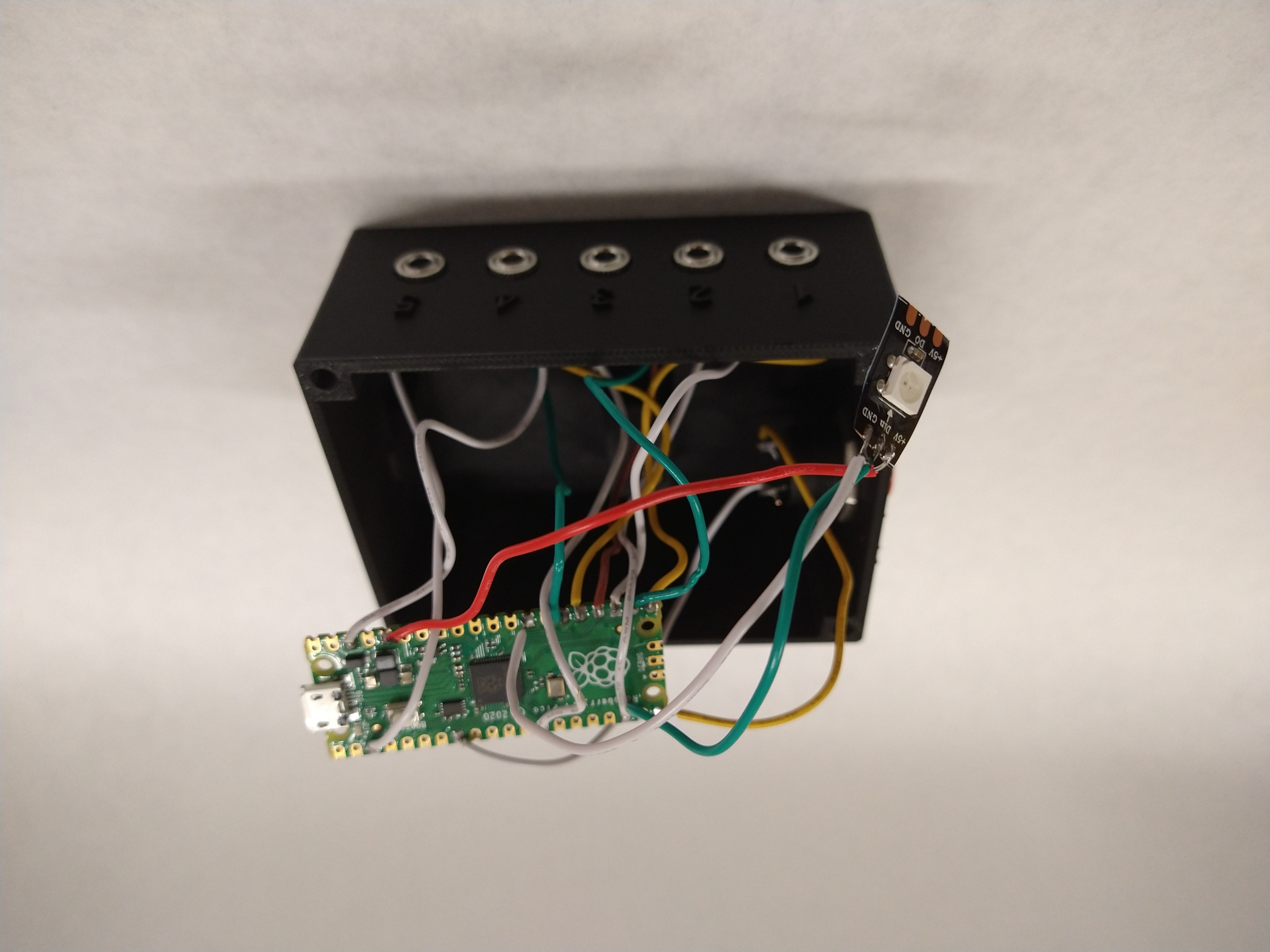 Soudure du Rapsberry Picofer à souder, troisième mainC'est l'étape la plus laborieuse, pour laquelle il faut être patient. Chacun des 15 fils (10 pour les prises, 3 pour le neopixel et 2 pour le bouton) doit être soudé à un endroit spécifique du microcontroleur afin de fonctionner avec le code qui est fourni. Le diagramme du circuit est ci-dessous; pour résumer, un fil par prise se connecte sur les terminaux suivants de gauche à droite 16-17-18-19-20 alors que le 15 est le mode et le 14 le signal du neopixel. Le fil 5V du neopixel est connecté sur 3.3v out pour recevoir du courant (3v est plus que suffisant pour une LED). Les sept autres fils, qui sont connectés aux terminaux GND, peuvent être branché sur ceux-ci de manière interchangeable sur le microcontrôleur, ils remplissent tous la même fonction. Ils sont en noir sur ce diagramme, étant donné que le fond est blanc, mais si vous suivez les recommandations ci-haut, ce sont les sept fils blancs. Il faut souder les fils sur le dessus du microcontrôleur, afin de lui permettre de bien être appuyé sur la base.